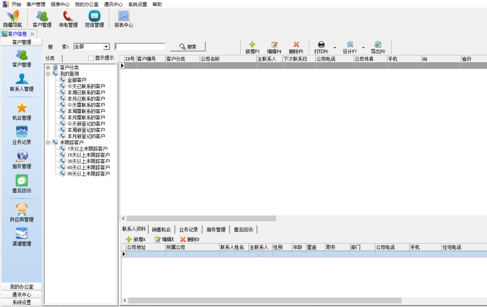 包括了客户资料管理、联系人管理、供应商管理、机会管理、服务管理、售后回访、业务记录和渠道管理。客户资料管理可以让用户轻松查看客户资料信息,方便售后回访工作,同时管理者可以随时查看业务记录了解客户跟进情况。