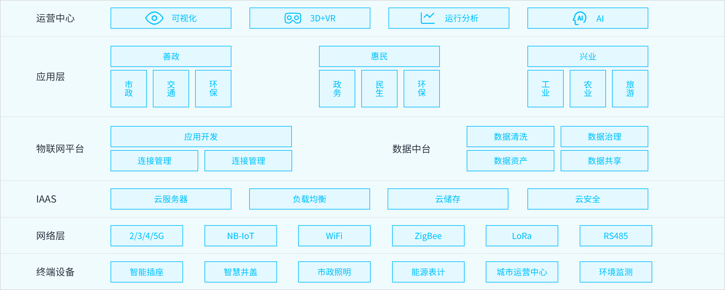 利用物联网、云计算、大数据、人工智能、可视化等技术建立1+2+N的产品模式。构建城市物联网平台,承载市政、能源、公共安全、环保、消防、交通等多个行业的感知终端接入。通过数据中台为各个部门提供数据共享,打破数据孤岛。运用人工智能、可视化等技术建立城市运营中心,掌控整个城市运行状况,更好的治理城市。同时提供智慧交通、智慧医疗、智慧环水、空气微站、智慧安监、智慧经服等行业应用,与运营中心协同治理城市